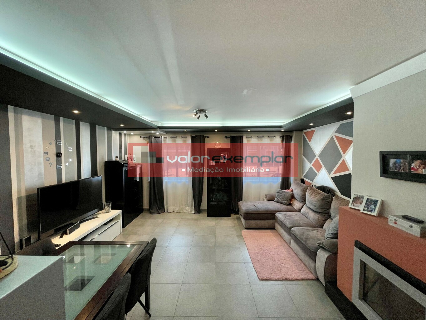 Sala com pavimento em mosaico, tecto falso com spots de iluminação embutidos, lareira elétrica.